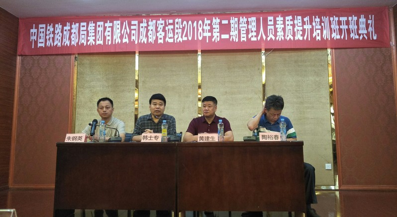 6月4日,中国铁路成都局集团有限公司成都客运段2018年第二期管理人员素质提升培训班开班典礼在华东交通大学南区专家楼顺利召开。到场的嘉宾有经管学院院长韩士专,成都局客运段副段长黄建生,经管学院副院长陶裕春,院长助理、培训班班主任朱钢英,会议由陶裕春主持。