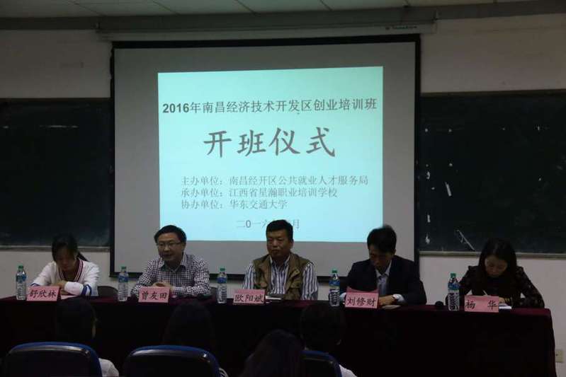 10月24日,2016年“南昌经济技术开发区华东交通大学创业培训班”开班仪式在北区31栋634室举行。南昌经济技术开发区公共就业和人才服务局副局长欧阳斌,我院党委副书记曾友田,华人策略研究论坛网站学工办主任刘修财,南昌经济技术开发区公共就业和人才服务局培训科负责人舒欣林,江西省星瀚职业培训学校校长杨华参加此次开班仪式,刘修财主持本次开班仪式。
