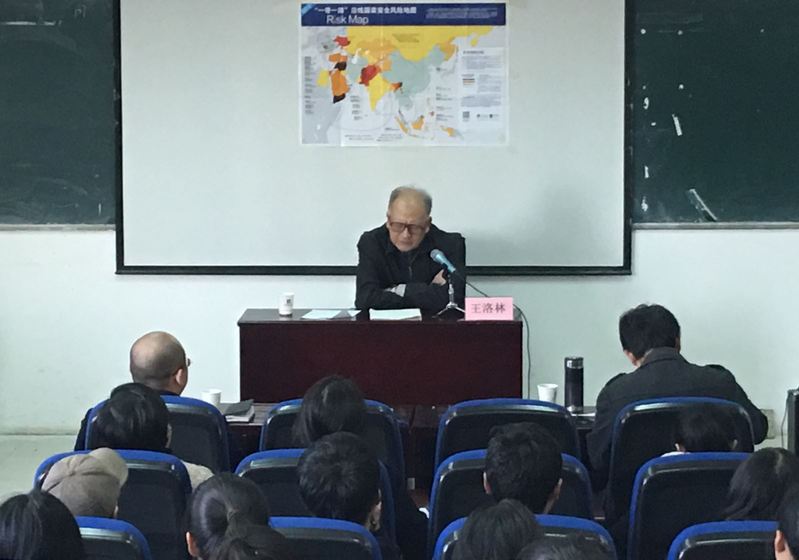 王洛林教授在讲话中从“一带一路”倡议的历史背景、重要内容、及所面临机遇和挑战三个方面对“一带一路”倡议作了详细的介绍。由“古丝绸之路”延伸至现在的“一带一路”。在讲到“一带一路”的重要内容时,王洛林教授结合路线图,向同学们展示了“一带一路”所涵盖的地区,他特别强调“一带一路”是中国对外开放的重要组成部分,是中国对外主张倡议的对内战略,是中国对外互联互通,互利共赢的战略。“机遇空前,挑战空前”,王洛林教授从中国自身存在的问题和世界的视角分析了中国“一带一路”面临的机遇和挑战。