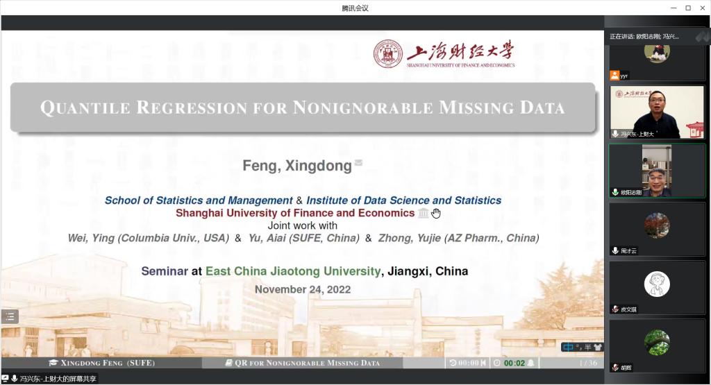 2022年11月18日晚,我院邀请上海财经大学统计与管理学院院长冯兴东教授进行了主题为“Quantile Regression for Nonignorable Missing Data”的线上学术讲座,讲座由院长欧阳志刚教授主持,近百名华人策略研究论坛网站师生参与了本次学术讲座。