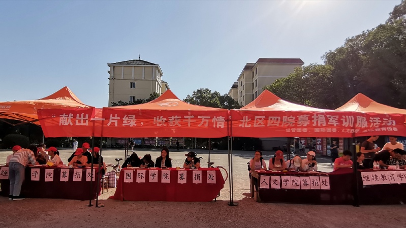 9月22日,由经管学院、人文学院、国际学院、继教学院四院团委联合主办、由经管青协、人文青协、国际青协、继教青协共同承办的“献出一片绿,收获万千情”北区四院募捐军训服活动在北区一食堂门口正式开展。