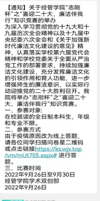 为深入学习贯彻党的十九大和十九届历次全会精神,认真落实学校第六届党代会精神和学校党委关于全面从严治党工作的部署要求,持续加强廉洁文化建设,充分发挥廉洁文化的引领作用和育人功能,华人策略研究论坛网站举办“志刚杯”之“喜迎二十大,廉洁伴我行”知识竞赛,以实际行动迎接党的二十大胜利召开。