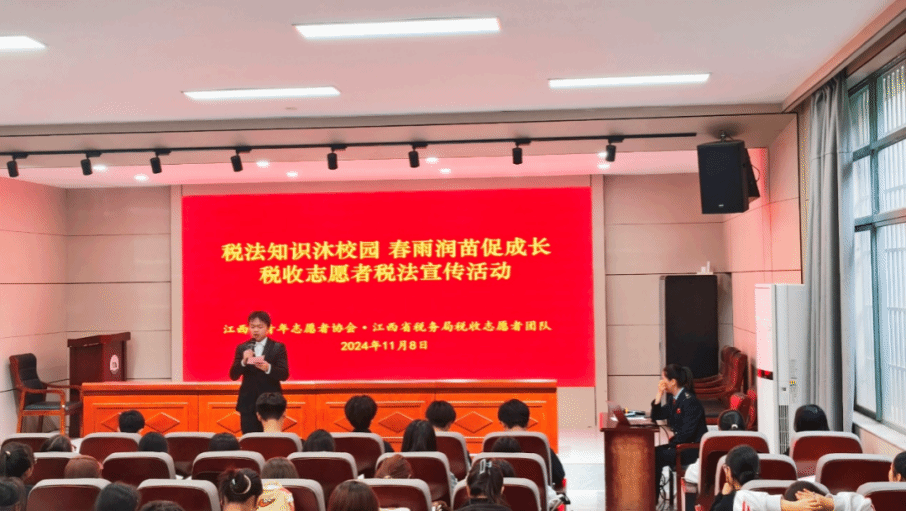 为进一步强化学生的公民意识与理财素养,提高纳税遵从度,推动税收文化传承,11月8日下午,由江西省青年志愿者协会、国家税务总局江西分局、省税务局税收志愿者团队等联合举办的“税法知识沐校园,春雨润苗促成长”税收志愿者进校园活动在31栋104教室开展。