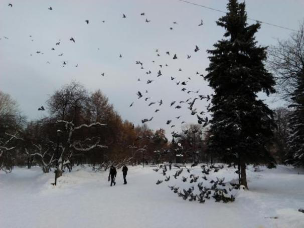 彼尔姆的生活还有一件有趣的事情便是那里满地不怕人的鸽子。在那里,鸽子就在自己脚边觅食,不怕人,在冬天更不怕冷,我们在冬天雪很厚的时候出去玩,就碰到过一大群鸽子在地上啄食,室外零下三十多度的气温,他们竟然不怕冷,这一点我是觉得不可思议的。看到这里我想大家肯定有这样一个疑问,那些鸽子不会被抓走吃了吗?我所看到是那里不会出现这样的情况。据说在那里人们抓鸽子是违法的,鸽子和人们和平相处。我在想如果国内也如此,那生活岂不是多了一个玩伴,闲时出去走走,喂他们点儿食物,看着他们互相争食,朝着你扔食料的方向飞去,实在无聊把他们惊得乱飞,自己立在鸽群里也是自在、充满乐趣。