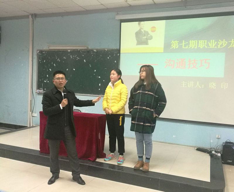 沙龙开始后,由主持人致辞并进行抽奖,然后隆重介绍本期讲师晓印。首先,晓印说出了自己曾经以一本毕业证、两本资格证进入正大集团的经历,并以游戏的方式告诉我们表情,声调,动作具有影响力的道理。然后他又以自己的面试经历和做面试官的经历告诉我们“没有任何人能够说服别人,只能给予心理暗示,让他自我说服”“给别人好的第一印象”等观点,接下来晓印还为我们介绍了恋爱沟通技巧以及职场技巧。整个讲座过程中,同学们积极配合,会场氛围十分活跃。