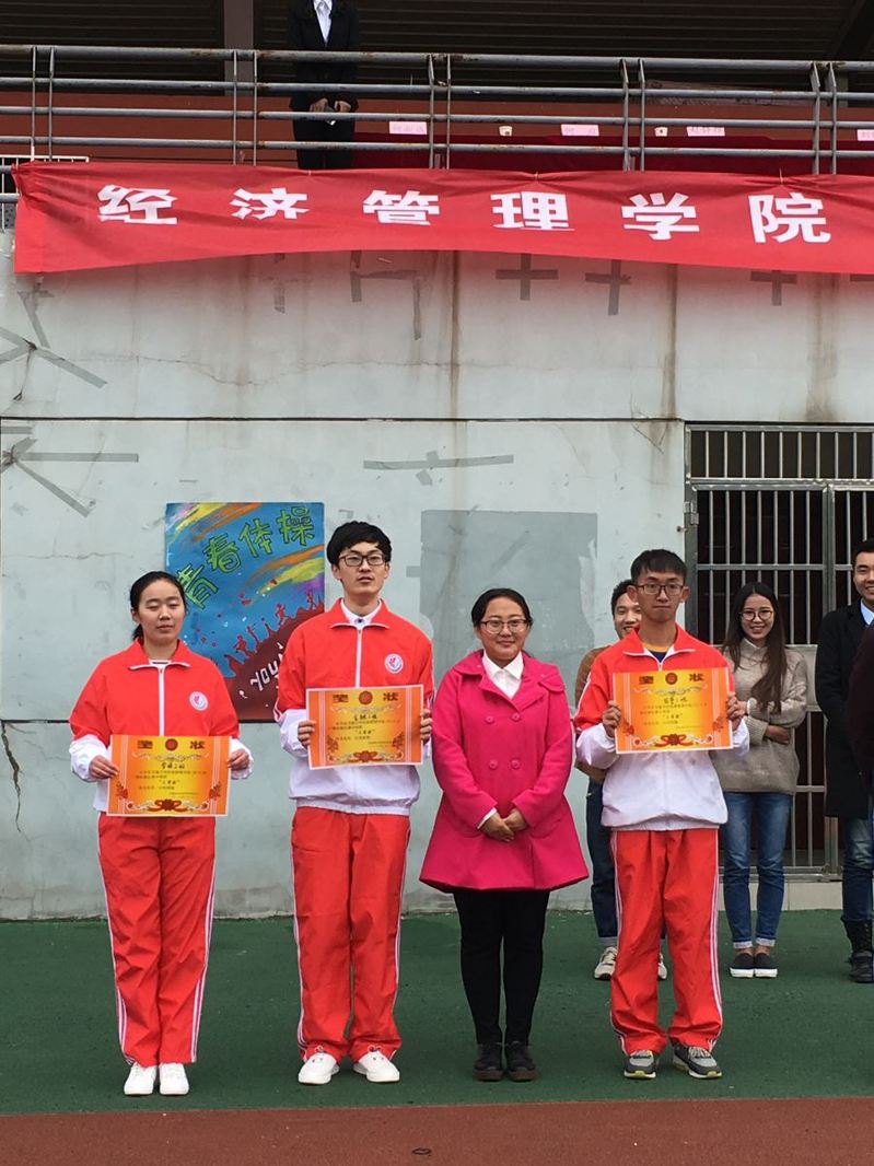 比赛开始,4个班级的同学按小组顺序进场,“德学双馨,济世经纬。团结拼搏,再创辉煌”,经管学院院训响彻北区田径场。同学们精神抖擞,动作整齐划一,力争把自己最佳的精神风貌展现出来。