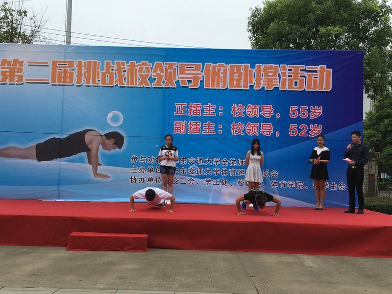 9月4日上午,由华东交通大学体育委员会主办,校工会、学工处、校团委、体育学院和校学生会协办的第二届挑战校领导俯卧撑活动及师生跳绳、踢毽子挑战活动在北区举办。校长罗玉峰、经管学院团委副书记曾友田亲临现场,观看比赛。