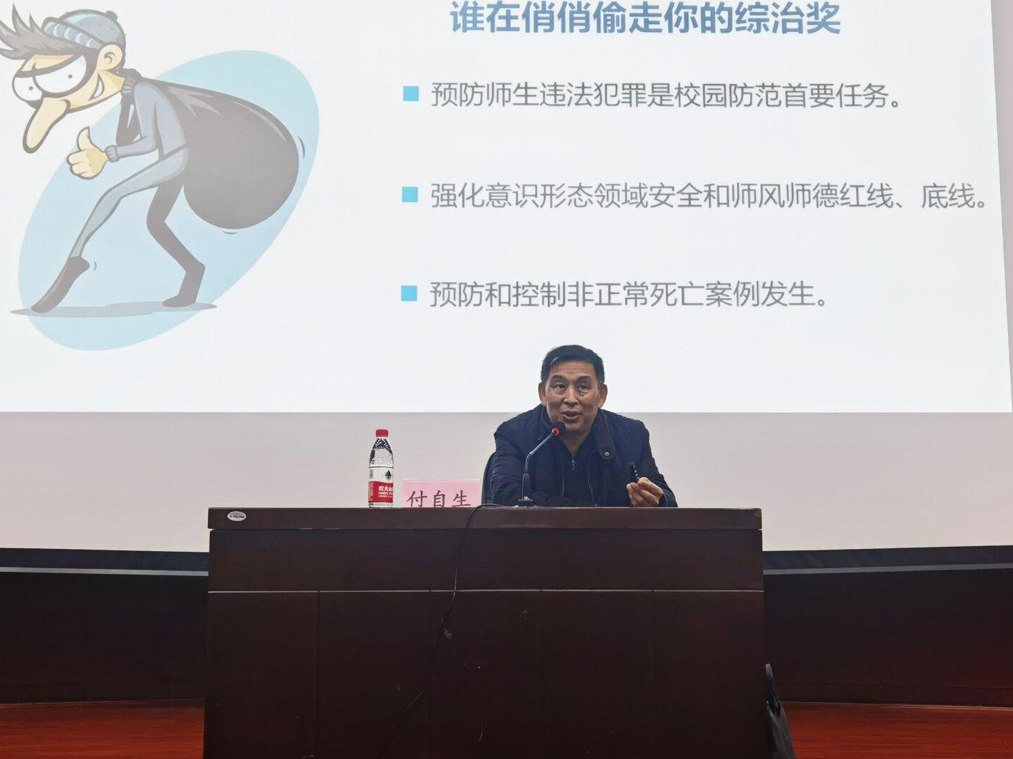 本次讲坛第一项进程重点强调三个方面:第一,预防师生违法犯罪是校园防范的首要任务;第二,强化意识形态领域安全和师风师德红线、底线;第三,预防和控制非正常死亡案例发生。付自生老师指明,现在仍有一些人因不了解我国历史以及中国共产党而发表贬低我国政策的不良言论,倡导我院各学生干部以及普通学生要树立正确价值观,守好底线。同时,针对预防非正常死亡事件的发生,付自生老师建议在场学生干部要多观察身边同学,在举行班级会议时应告知同学要互相关心,做到早发现、早报告,从而有效预防我院师生犯罪活动的发生。