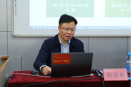 杨德敏指出,党的二十大是一次高举旗帜、凝聚力量、团结奋进的大会,为新时代新征程党和国家事业发展、实现第二个百年奋斗目标指明了前进方向、确立了行动指南。围绕党的二十大报告中提出的“过去五年的工作和新时代十年的伟大变革”、“新时代新征程中国共产党的使命任务”、“中国式现代化的本质要求”等内容,杨德敏教授对党的二十大精神进行了全面、系统、深入、准确的阐述和解读。