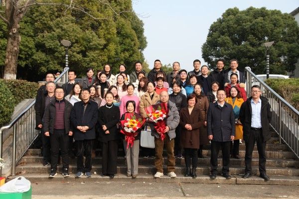 院党委书记余得生和分工会主席陈馨为荣退老师献花。